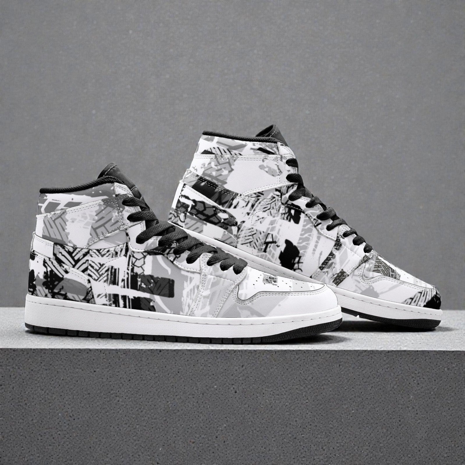 Die Unisex High-Top Sneaker von shouji mit dem Design Static Noise zeigen ein grafisches Schwarz-Weiß-Muster mit Pinselstrichen, Streifen und abstrakten Formen. Die verschiedenen Elemente überlagern sich und bilden ein dichtes, urbanes Print.